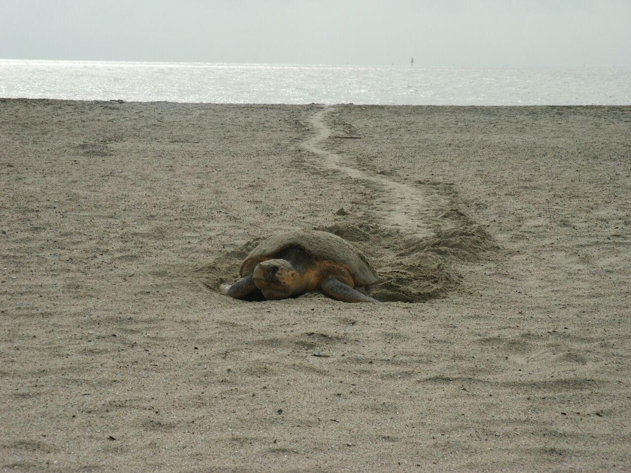Female loggerheads crawl out of the ocean at night to nest. They make their way up just past the high tide line and dig a deep round hole using their two rear flippers. The mother then lays her eggs in the hole and covers it back up with sand before leaving.